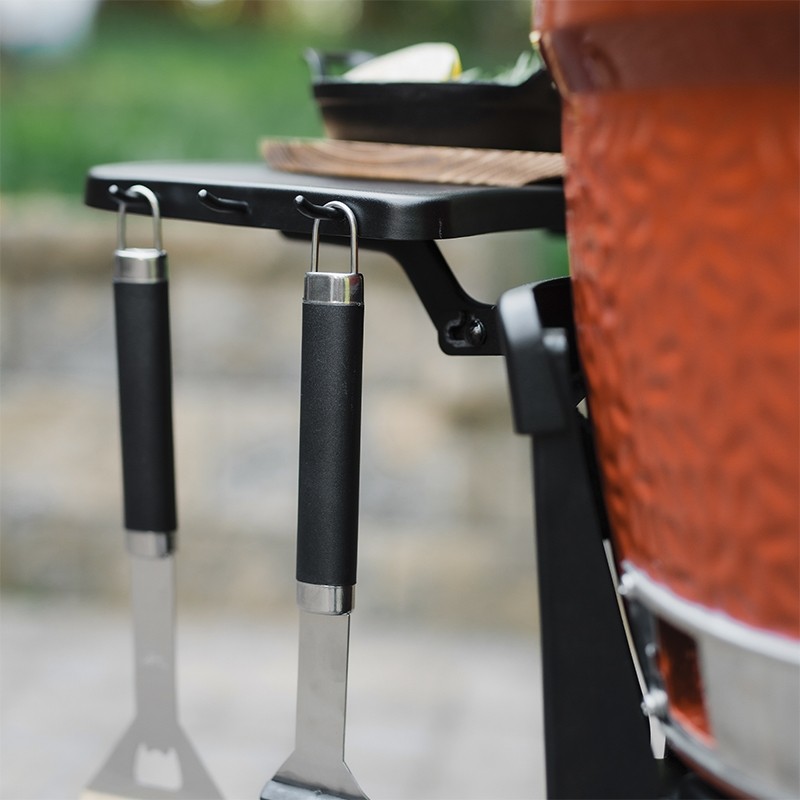 Επιπλέον το καρότσι Kamado Joe Jr (κωδικός: KJ15112524) έρχεται εξοπλισμένο με πρακτικά άγκιστρα εργαλείων στα πλευρικά ράφια, προσφέροντας άμεση πρόσβαση και ασφαλή τοποθέτηση για όλα τα εργαλεία που χρησιμοποιείτε. Αυτή η έξυπνη προσθήκη ενισχύει την άνεση και την οργάνωση, επιτρέποντάς σας να έχετε όλα όσα χρειάζεστε πάντα κοντά σας και τακτοποιημένα.