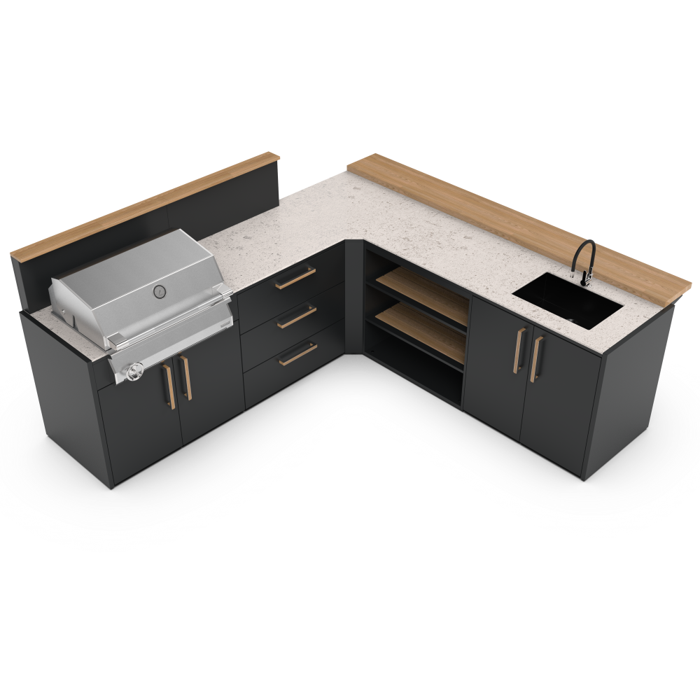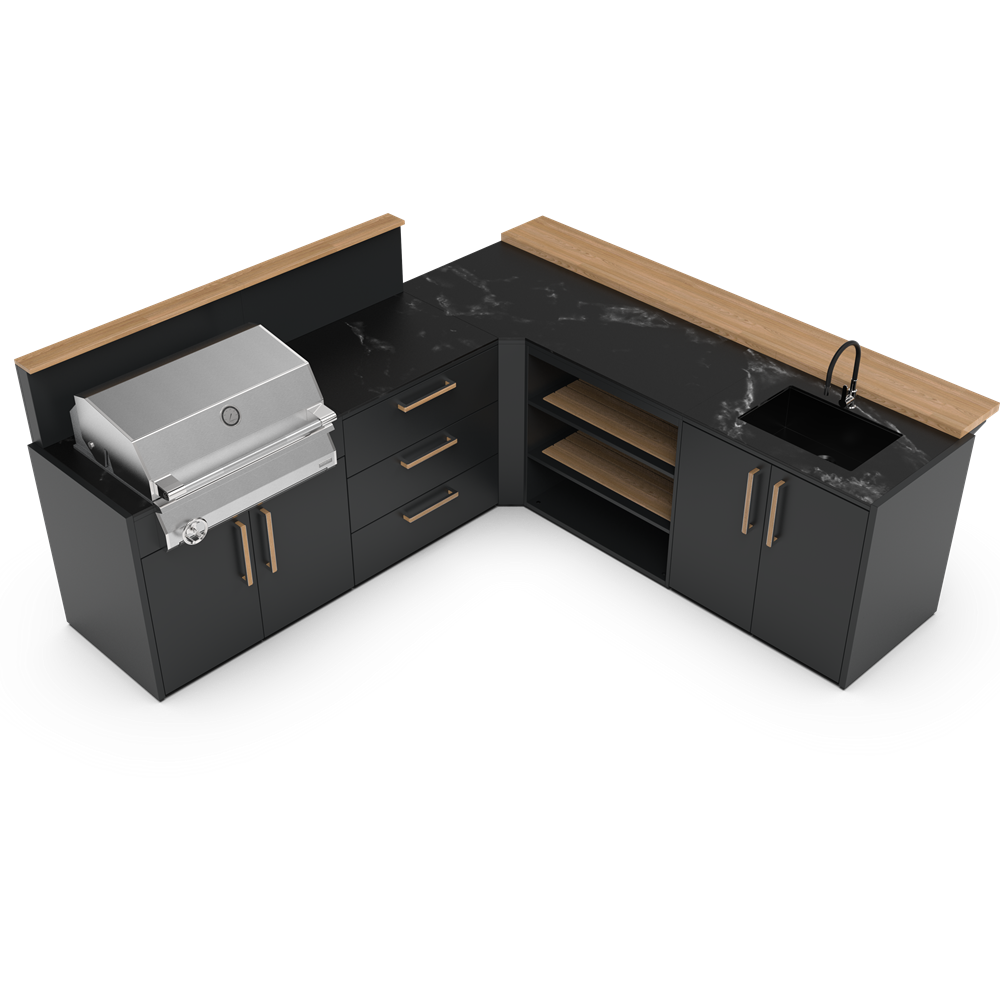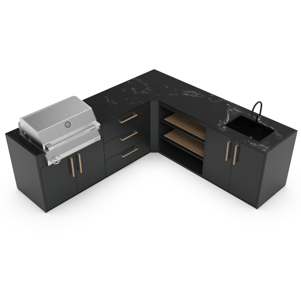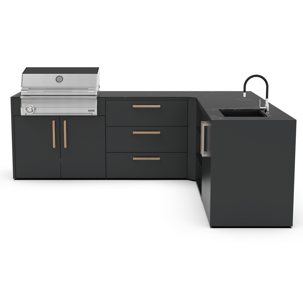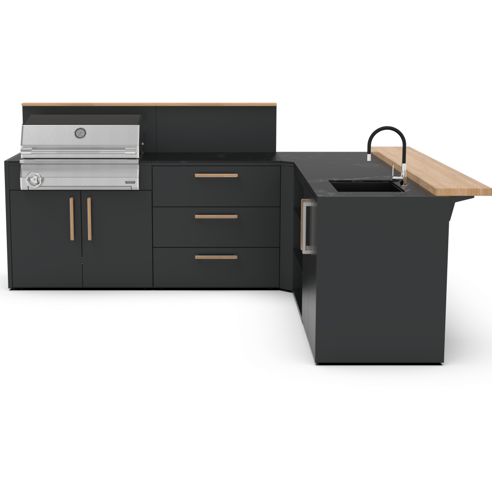 Κατασκευασμένο με υλικά υψηλής ποιότητας που αντέχουν στη δοκιμή του χρόνου. Ο σκελετός είναι κατασκευασμένος από ανθεκτικό γαλβανισμένο ατσάλι με διπλή βαφή πούδρας, πιστοποιημένη από την Qualicoat. Επίσης τα χερούλια είναι κατασκευασμένα από στιβαρό ξύλο μπαμπού ικανό να αντέξει ακόμα και στο πιο απαιτητικό περιβάλλον. Με τα υλικά της εξωτερικής κουζίνας Brabura όχι μόνο εξασφαλίζετε ανθεκτικότητα αλλά και προσθέτετε στυλ στον εξωτερικό σας χώρο. Αναβαθμίστε την κουζίνα σας με ανοξείδωτο ατσάλι 304 ή 316. Δώστε στην κουζίνα σας την ποιότητα και την αντοχή που της αξίζει, επιλέγοντας ανάμεσα σε ανοξείδωτο ατσάλι 304 ή 316. Και οι δύο κατηγορίες αποτελούν κορυφαίες λύσεις για οικιακές και επαγγελματικές εφαρμογές, προσφέροντας υψηλή αισθητική και εξαιρετική διάρκεια ζωής. Η κάθε μονάδα κουζίνας έχει σχεδιαστεί ειδικά για να ταιριάζει άψογα με όλη τη γκάμα των μαγειρικών μας συσκευών, όπως Big green Egg, φούρνοι πίτσας, ψησταριές υγραερίου και κάρβουνου. Οι εξωτερικές κουζίνες της Brabura περιλαμβάνουν εύχρηστα χαρακτηριστικά όπως συρτάρι για εισαγωγή και εξαγωγή μπουκάλας αερίου αερίου, ευρύχωρα συρτάρια αποθήκευσης. Αλλά αυτό που πραγματικά κάνει τις κουζίνες μοναδικές είναι ο πρωτοποριακός πάγκος Neolith για αντοχή υπό οποιαδήποτε καιρικές συνθήκες. Διατίθεται σε δύο κομψά φινιρίσματα: Iron Frost και Iron Satin, σε μαύρο χρώμα και λευκό αντίστοιχα. Αυτά τα υλικά από πορσελάνη είναι εξαιρετικά ανθεκτικά στα στοιχεία, χάρη στη μη πορώδη επιφάνειά τους, η οποία αντέχει επίσης γρατσουνιές και υψηλές θερμοκρασίες. Η συγκεκριμένη σύνθεση εξωτερικής κουζίνας με κωδικό KC.C007 περιλαμβάνει:- End Panel, τερματικά πάνελ που τοποθετούνται στην αρχή ἠ το τελείωμα της εξωτερικής κουζίνας, από γαλβανισμένο μέταλλο με διπλή ηλεκτροστατική βαφή.