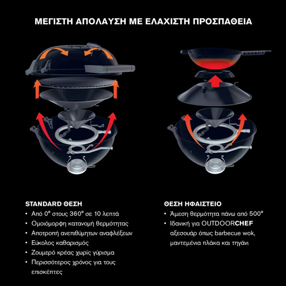 Το καινοτόμο σύστημα χοάνης με την τεχνολογία Gourmet Burner επιτρέπει συνεχή ρύθμιση θερμοκρασίας από 80 έως 360 βαθμούς στην τυπική θέση. Αυτή η ομοιόμορφη κατανομή θερμότητας δημιουργεί μια σταθερή θερμοκρασία σε ολόκληρο το μπάρμπεκιου και στη σχάρα και εξαλείφει την ανάγκη να γυρίσετε το φαγητό. Από κάπνισμα στους 80 βαθμούς έως χαμηλό και αργό μαγείρεμα στους 110 έως 130 βαθμούς ή τραγανή πίτσα στους 360 βαθμούς, όλα είναι δυνατά. Εάν θέλετε να αυξήσετε πραγματικά τη θερμοκρασία για το barbecue wok ή την μαντεμένια πλάκα, απλώς περιστρέψτε τη χοάνη στη θέση του ηφαιστείου για συγκεντρωμένη θερμότητα έως και 500 βαθμούς.